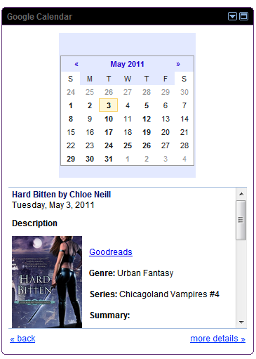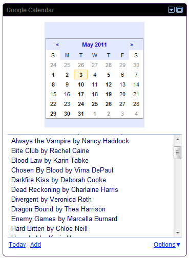 This information is pulled from my shared Google Calendar "New & Upcoming Book Releases" and should be viewable inside Google Reader.